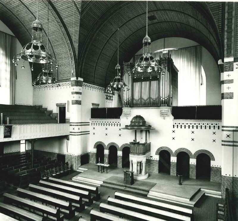 Het grotendeels nog oorspronkelijke interieur wordt overkluisd door grote houten tongewelven, gedragen door hoekpijlers. De wanden zijn lichtgeel gepleisterd met toepassing van schoon metselwerk als afwisseling bij de hoekpijlers. In drie van de vier wanden zijn rondboogvensters met glas-in-lood ramen en houten galerijen op verdiepingsniveau. Aan een zijde is een gemetselde stenen tribune waarop het orgel in houten kas met versieringen uit de bouwtijd. Orgel is niet van waarde uit het oogpunt van monumentenzorg. De orgelkast is wel monumentwaardig Voor deze tribune is de preekstoel op zandstenen onderbouw met pijlers, voorzien van gebeeldhouwde kapitelen. Aan weerszijden van de preekstoel in schoon metselwerk uitgevoerde arcaden bestaande uit drie rondbogen. De kerk bezit voorts koperen kronen, versierd in dezelfde stijl als het kerkmeubilair.
