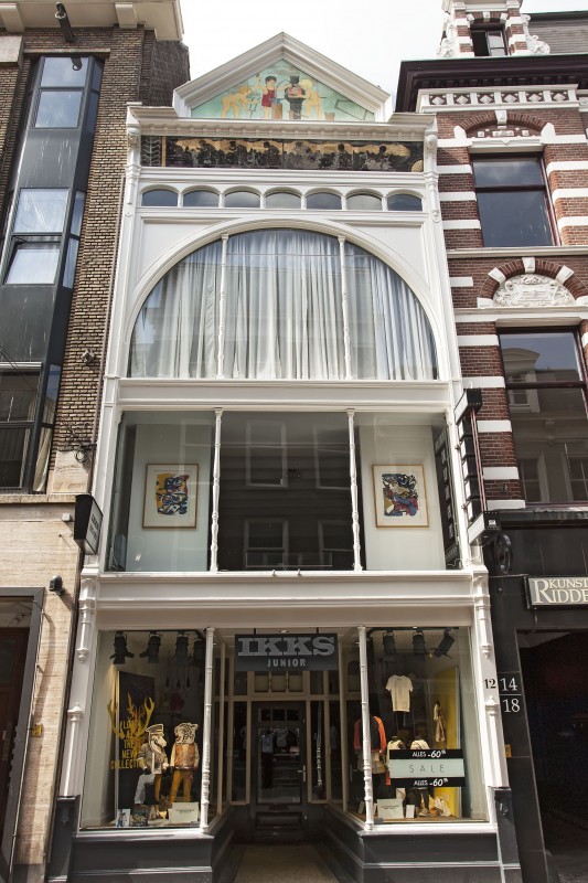 Pand op rechthoekige plattegrond bestaande uit drie bouwlagen onder kap. De toonzaal bestond van oorsprong uit een ongedeelde ruimte met gaanderijen over twee verdiepingen. De voorgevel is opgebouwd uit ijzer en glas. Door de toepassing van een glasgevel en ijzeren draagconstructie wordt hier gebroken met de conventionele opvattingen over gevelarchitectuur. De glazen façade heeft een grote rondboog over twee verdiepingen, waarin balustervormige houten ondersteuningen en ijzeren horizontale puibalken. Boven de grote rondboog is een reeks van smalle, getoogde vensters over de gehele gevelbreedte. Opvallend is het schuin geplaatste fries van de kroonlijst. Voor het uiterlijk is gebruik gemaakt van de classicistische vormentaal met figuratieve schilderingen in de frontonvormige gevelbekroning betrekking hebbend op het fietsenmakersvak en "schilderingen" in het onderliggende fries met klassiek-Griekse figuren. De smalle eindpenanten van de gevel eindigen als consoles met een mannenkop. Op de begane grond is de entree verdiept gelegen, met aan weerszijde van het portiek etalagekasten met bewerkte ijzeren zuiltjes op hardstenen basement. De houten deur in het portiek met bovenlicht is uit de bouwtijd.