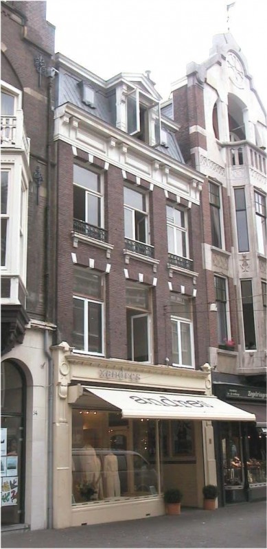 Pand in eclectische trant uit het laatste kwart van de 19de eeuw met een lijstgevel ter breedte van drie vensterassen en bestaande uit een parterre en twee verdiepingen onder een met leien bedekt mansardedak. Dakkapel met fronton en goed gedetailleerde kleine ramen ter weerszijden. De vensters liggen onder strekken met gepleisterde sluitstenen, en bevatten T-stolpramen met raamhekjes en houten dorpels op oonsoles. Hoofdgestel met panelen en zes paarsgewijs geplaatste consoles. Goed gedetailleerde en harmonieuze winkelpui uit het begin van de 20ste eeuw.