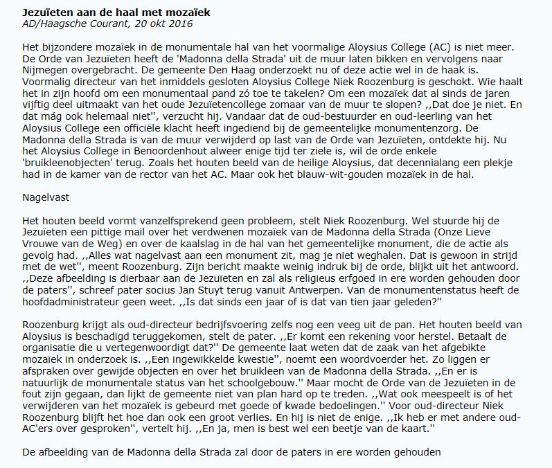 Het Sint Aloysisuscollege met patershuis is van cultuurhistorische waarde vanwege de eraan verbonden geschiedenis van de Nederlandse jezuïeten en de Sint Willebrordusstichting. Tevens heeft het architectonische waarde als goed voorbeeld van een door een landelijk bekend architect ontworpen complex in de traditionele, zware bouwtrant die toentertijd bij katholieke scholen gebruikelijk was. Kunsthistorische waarde bezitten de diverse bewaard gebleven interieuronderdelen waarvan met name de glas-in-lood ramen van glazenier Lou Asperslagh van grote betekenis zijn. Tevens heeft het complex stedenbouwkundige waarde door de vrije situering langs de Oostduinlaan en 't Hoenstraat.