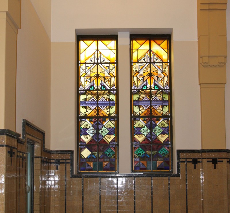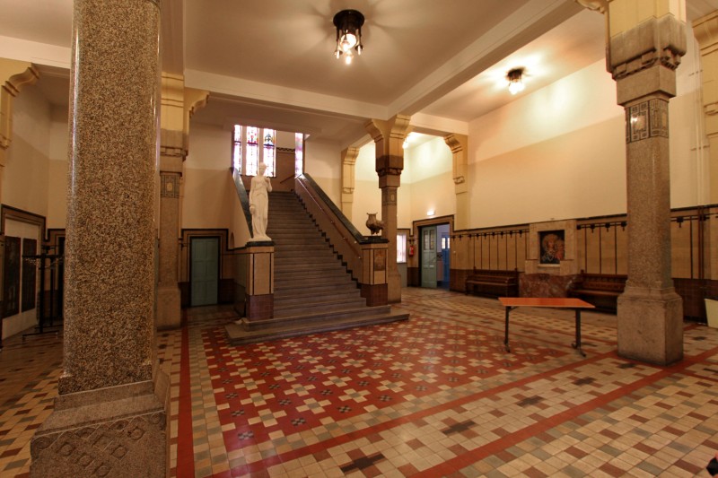 De ingangshal met hoofdtrap is vrijwel geheel in oorspronkelijke staat bewaard gebleven met rijke interieurafwerkingen (onder meer in patronen gelegde vloertegels en houten banken langs de muren waarboven en waarlangs tegelafwerkingen in Art Decostijl). Ook de aula heeft veel nog veel originele afwerkingen waaronder hoge houten paneellambrizeringen. De vroegere kapel is in de loop der tijden ingrijpend verbouwd en sinds circa 1960 niet meer als zodanig in gebruik. Zeer waardevol in deze drie ruimten zijn de grote glas-in-lood ramen, vermoedelijk allen van de glazenier Lou Asperslagh met bijbelse voorstellingen in de kapel en meer ornamentele ramen in de hal en aula.
