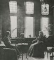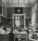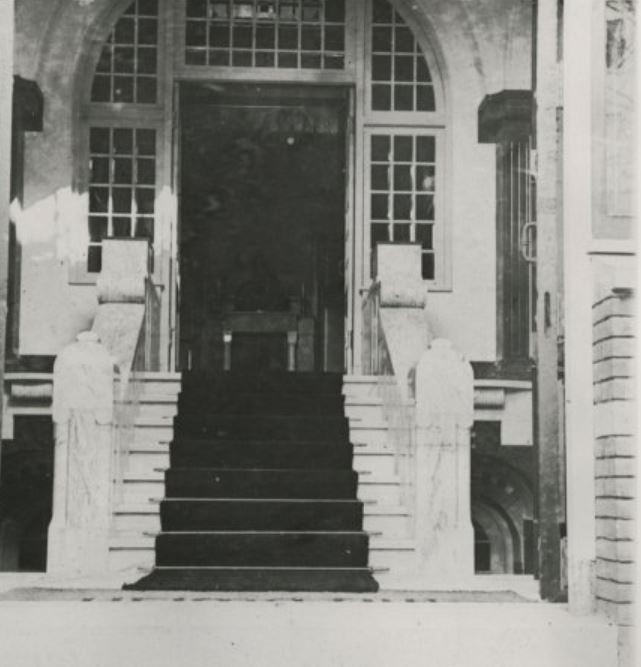 De ingangspartij omvat een deur in een getoogde omlijsting, waarin opgenomen een gebrandschilderd glas-in-lood met voorstelling van Wajangpoppen en als sluitsteen een gevleugelde karbouwenkop. Hierboven een reliëf, waarop een transport van suikerriet op door karbouwen getrokken wagens is afgebeeld. Deze sculpturen zijn vervaardigd door F. V. Broese van Groenou.