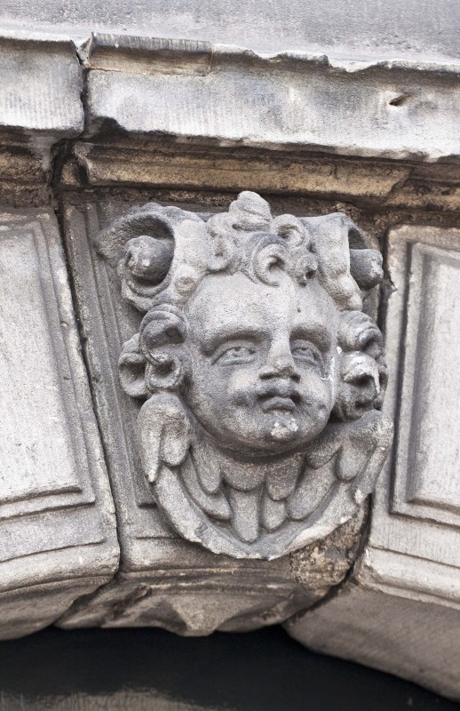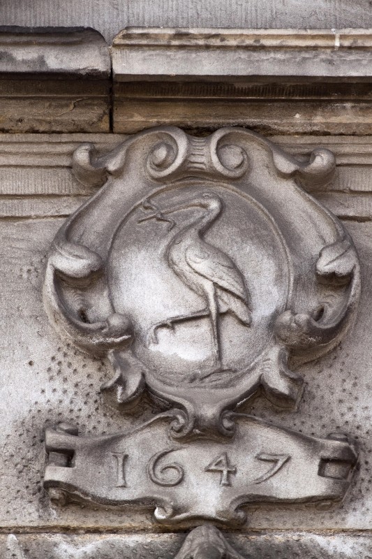 Een witmarmeren plaquette in het portaal van het poortgebouw herinnert aan deze restauratie.