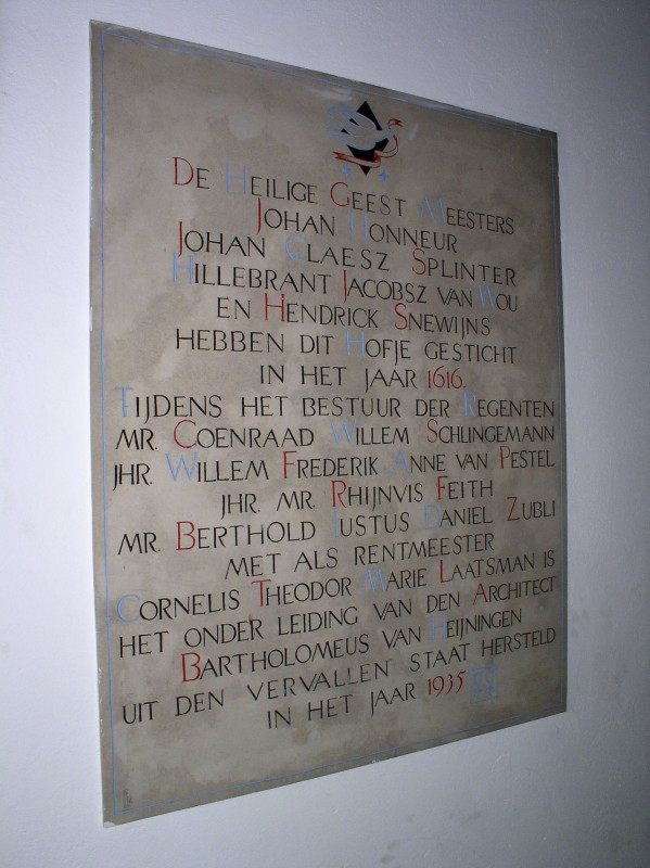 Ook de regentenkamer werd onder handen genomen. Het was een eenvoudig vierkant vertrekje dat de portier als logeerkamer en als provisiekamer voor de opbrengst van de vruchtbomen in de tuin had gebruikt. Het originele moer- en kinderbintenplafond werd weer in het zicht gebracht en er werd een nieuwe schouw naar zeventiende-eeuws model geplaatst. Boven de schouw hangt een schilderij uit 1579 van de schilder Anthonie Blokland van Montfoort in een rijk bewerkte houten lijst waarop de uitreiking van het brood aan de armen door de Heilige Geestmeesters in de Sint Jacobskerk staat afgebeeld. k de regentenkamer werd onder handen genomen. t dit over het zelfde onderwerp: poort. eerd en van nieuwe pannen voorzien.\e op