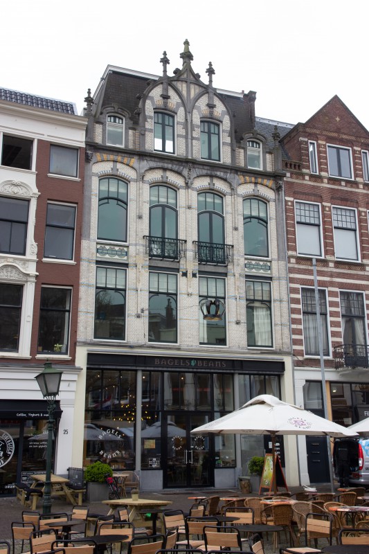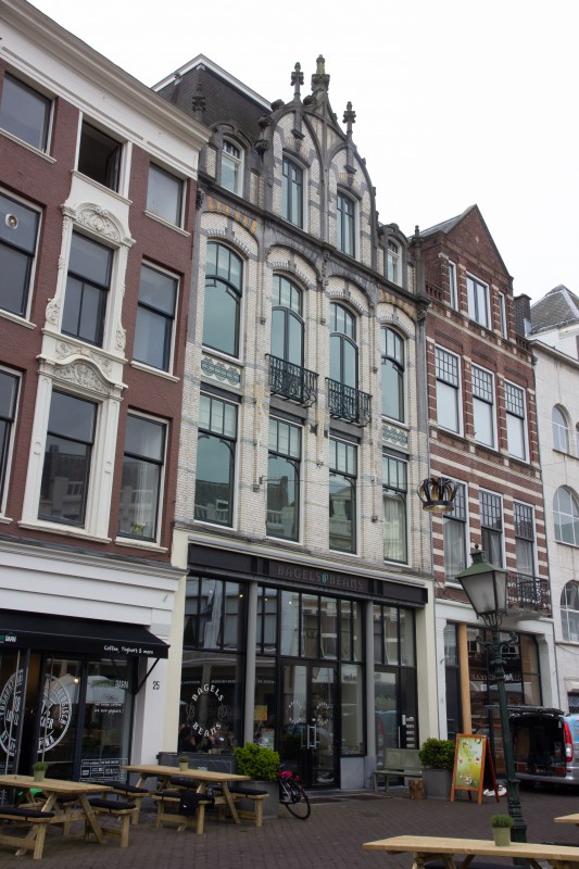 Het Weense idioom heeft de architect aangepast binnen een typisch Hollands gevelschema met gotische motieven in de geveltop.