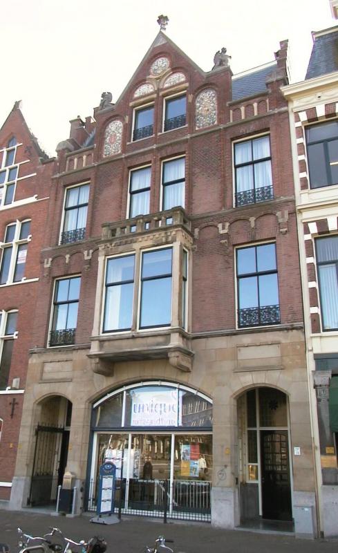 Pand van parterre, twee verdiepingen en zolderverdieping met natuurstenen onderpui waarin segmentvormig gebogen étalageraam en portalen. Het overige van de gevel is in baksteen uitgevoerd met uitzondering van de erker op de eerste verdieping tegen de middenas, waarvoor natuursteen is toegepast. De verdiepingen worden gescheiden door geprofileerde waterlijsten; onder de waterlijst tussen de eerste en tweede verdieping een fries van segmentboogjes. De middenpartij is voor het door trapgevels geflankeerde, dwarse zadeldak hoger opgetrokken met een puntgevel waarin rondboognissen met kleurige tegeltableaux in Art Nouveau en twee zoldervensters. De van een natuurstenen lijst voorziene puntgevel wordt door een kruisbloem bekroond en bezit bij de aanzetten gevleugelde dierfiguren met wapenschilden. Aan weerszijden van de puntgevel een blinde rondboogbalustrade met hoekpenanten waarop gebeeldhouwde Art Nouveau bekroningen.