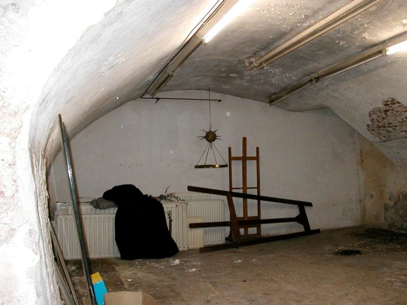 Een van de twee kleine met een tongewelf gedekte kelders onder de openbare straat gezien richting de doorgang naar de kelder onder het pand.