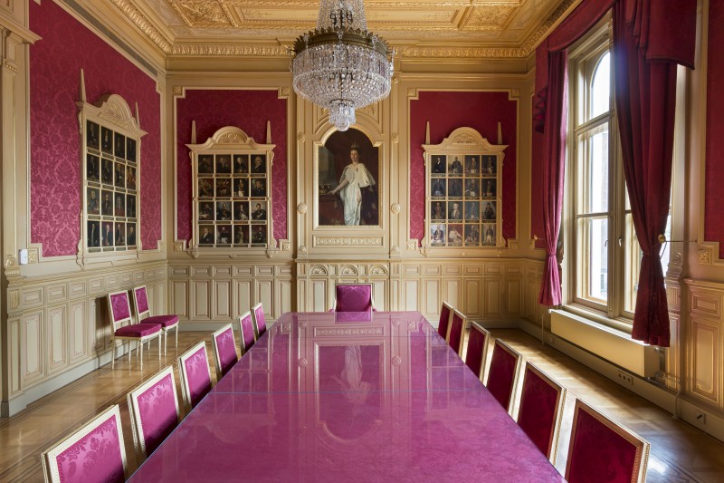 De dubbele toegangsdeuren hebben een versiering met panelen. In deze zaal voorts een langwerpige tafel met 19 stoelen in Lodewijk XVI-STIJL en portretten van alle gouverneurs-generaal van het v.m. Nederlands Indie tussen 1610 en 1945, in neo-barokke omlijstingen. Kristallen kroonluchter.