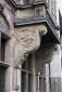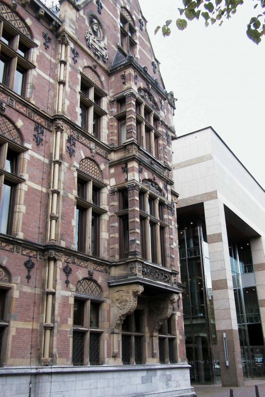 De meest rechtse risaliet heeft een rijk gebeeldhouwde erker op consoles. De zijgevel aan de Lange Poten telt eveneens drie risalieten, waarvan de meest westelijke een erkeruitbouw met rijke sculptuur bezit. Te weerszijden hiervan allegorische vrouwenfiguren: de Waarheid en de Spaarzaamheid, gebeeldhouwd door B.J.W.M. van Hove te Amsterdam. Het metselwerk van de gevels wordt verlevendigd door natuurstenen banden, negblokken en sierankers. De vensters hebben natuurstenen kruiskozijnen en ontlastingsbogen met blokken, sluitstenen met maskerkoppen en vlechtwerkvullingen. In de topgevels van de risalieten cartouches en medaillons, waarin de koppen van zes rechtsgeleerden.