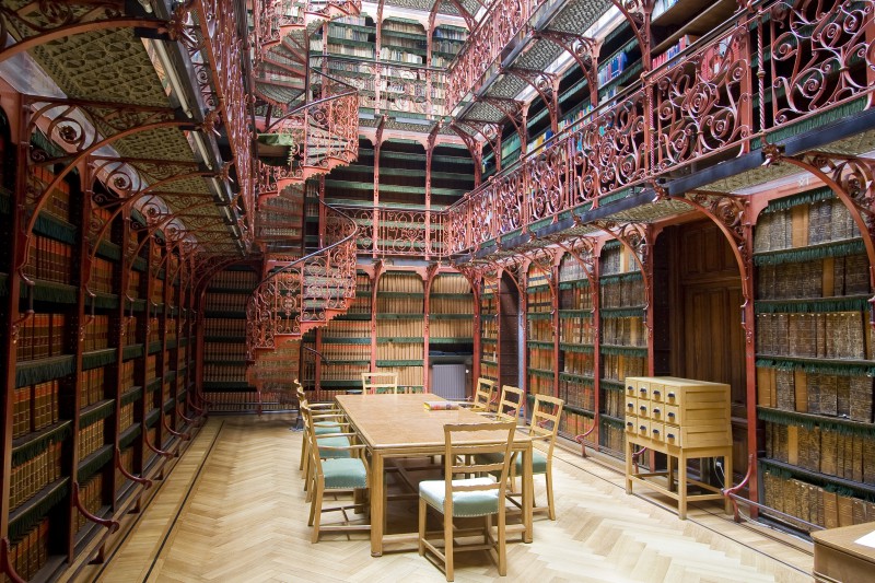 Aan de westzijde van de binnenplaats bevindt zich de bibliotheek. Langs de wanden van deze ruim dertien meter lange zaal boven elkaar drie op smeedijzeren consoles rustende gaanderijen van ijzer met eveneens ijzeren balustraden. In een der hoeken een smeedijzeren wenteltrap met spil en a jour gegoten treden. De lichtkoepel bevat een glas in loodraam van de fa.Nicolas te Roermond. Op deze verdieping hebben aan het einde van de zuidelijke vleugel de kamers nr XIV, XV en XVI beschilderde houten plafonds uit de 17e eeuw, afkomstig uit het ter plaatse van het tegenwoordige gebouw gestaan hebbende vroegere ministerie van Justitie, het Huygenshuis en het Stadhouderlijk Kwartier op het Binnenhof.