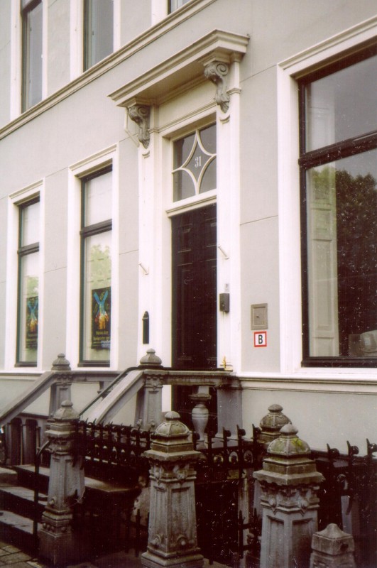 Pand met gevel omstreeks 1800 met kroonlijst op gesneden consoles en deuromlijsting.