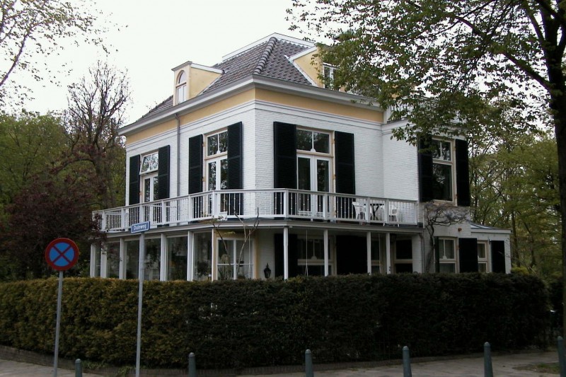 Het bakstenen, witgesausde huis beslaat een ongeveer vierkante plattegrond, omvat een parterre en verdieping met omlopend, afgeknot schilddak en is twee vensterassen breed. De rechter vensteras springt aan de voorzijde naar voren en bezit een dakterras met houten hek. De deur in de voorgevel vertoont gietijzeren siertraliewerk. De stolpramen in de vensters zijn deels vervangen door ramen in een modern materiaal. De gevels worden afgesloten door een omlopend hoofdgestel van hout. In het schilddak bevinden zich dakkapellen met getoogde vensters. Tegen de voorgevel en de linker zijgevel bezit het pand houten veranda's met balkons en gietijzeren hekken. De rechter zijgevel en de achtergevel zijn grotendeels blind.