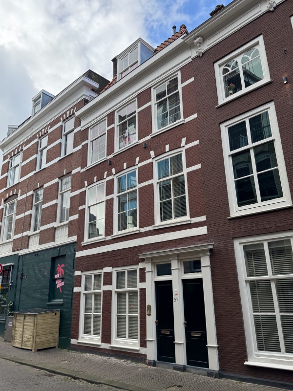 Pand met eenvoudige 19de eeuwse gevel, drie bouwlagen hoog, drie vensterassen breed met een rechte kroonlijst onder een schilddak, waarin centraal een dakkapel. De gemoderniseerde winkelpui heeft een geprofileerde houten omlijsting op een hardstenen plint. Rechts bevindt zich de entree tot de woning, een eenvoudige deur met bovenlicht.