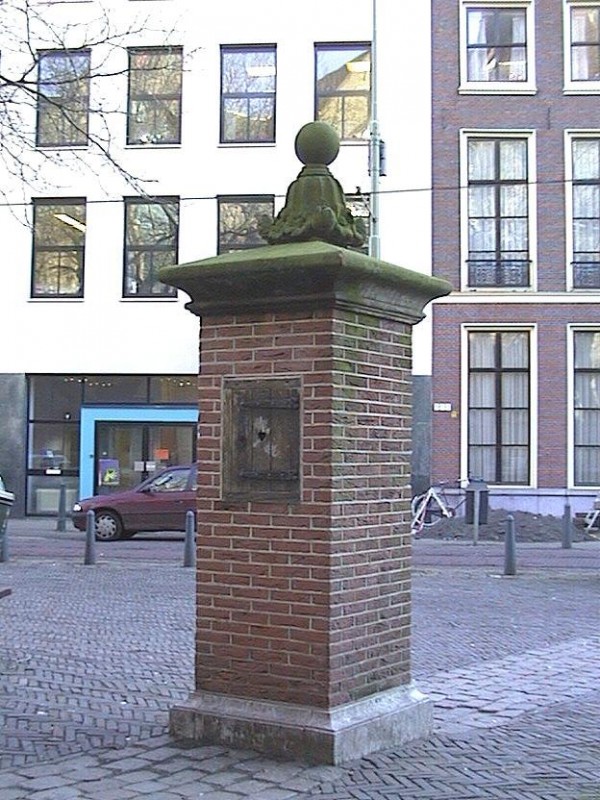 De van elders uit de stad afkomstige bakstenen stadspomp op Rond de Grote Kerk staat op een natuurstenen voetstuk. De pomp wordt be#indigd met een fors geprofileerde natuurstenen afdekplaat. Aan een van de randen van de afdekplaat is het gemeentewapen van Den Haag bevestigd, gevat in een sierlijke cartouche. De pomp wordt bekroond met een decoratie, bestaande uit een bol met weelderige bloemen, acanthusbladeren en dennenappels.