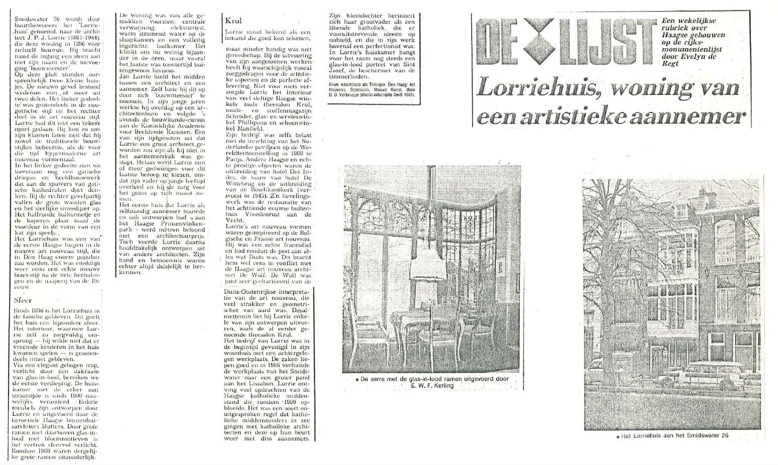 Het woonhuis aan het Smidswater, dat de architect-aannemer Lorrie voor zichzelf ontwierp, is het resultaat van een ingrijpende verbouwing. Tot 1805 was er sprake van twee smalle panden, die in dat jaar werden samengevoegd achter een nieuwe voorgevel, maar inwendig vermoedelijk nog steeds herkenbaar waren. In 1897 verbouwde Lorrie dit huis waarbij de huidige voorgevel tot stand kwam. De oude tweedeling is nog herkenbaar in de gevel. Inwendig resteert mogelijk met name aan de achterzijde nog een deel van de forser uitgevoerde gemeenschappelijke bouwmuur tussen beide voormalige huizen, terwijl deze aan de voorzijde tegenwoordig grotendeels zijn samengevoegd. Links is de voorgevel meer geïnspireerd op de neogotiek, terwijl in de rechter travee de vormgeving meer verwant is aan de Art Nouveau. De grote glasvlakken, waarvan het glas- in lood werd vervaardigd door E.W.F. Kerling, geven een voor die tijd ongekend grote lichttoetreding. Met name in het interieur heeft Lorrie een vloeiend-dynamisch lijnenspel toegepast, waaruit blijkt dat hij al vroeg op de hoogte was van de in de Belgische Art Nouveau toegepaste ornamentiek.