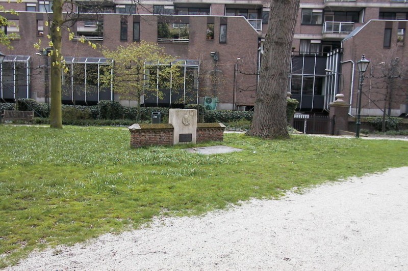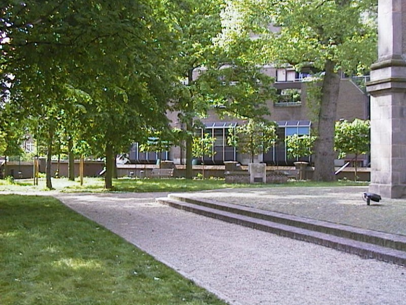 Het kerkterrein (voormalige kerkhof met toegangswegen tot de kerk en o.a. het graf van Spinoza) rondom de kerk afgeperkt met een stenen muur en aan de zijde van het Spui met hekwerk tussen stenen pijlers. Op de natuurstenen pijlers vazen, eveneens van natuursteen.