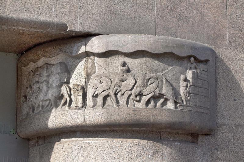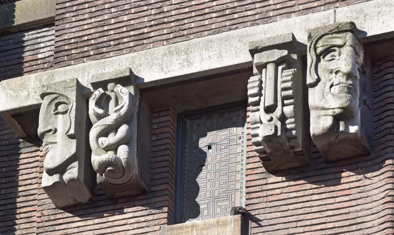 Voorzijde van een warenhuisgebouw; de grotendeels bakstenen gevel is bij de parterre bekleed met een naar voren springend gevelvlak dat boven de parterre door muurdammen in zeven traveeen is verdeeld, waarin smalle, hoge vensters (in oorsprong met stalen kozijnen). Boven deze raampartij is een zware, natuurstenen latei, gedragen door gebeeldhouwde consoles. Hierboven een verdieping met zes vensters waarin driedelige (in oorsprong stalen) kozijnen. Het terugliggende rechter gedeelte van de gevel, gemarkeerd door afgeronde hoeken in het metselwerk, bezit in de parterre een paraboolvormige toegangspoort in natuurstenen omlijsting en daarboven een verticale reeks liggende vensters van het trappenhuis. Aan de bovenzijde wordt dit bouwdeel bekroond door zwaar, natuurstenen lijstwerk. Met de terugliggende dakverdieping en het vooruitspringende, lagere geveldeel vormt deze rechter hoekpartij een plastisch geheel. De parterre bevat voorts teruggerooide brede etalageruiten met ingang in het midden en links een verdiepte, rechthoekige inrijpoort.