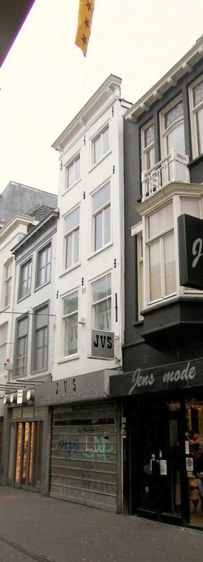 De voorgevel dateert in hoofopzet uit de achttiende eeuw getuige het metselwerk, de "op vlucht" gebouwde constructie en de beperkte breedte. De gevel is in de loop van de negentiende gemoderniseerd door het vervangen van kozijnen, ramen en kroonlijst. Vermoedelijk is het pand toen ook opgehoogd met een extra verdieping. De begane grond bezit een vrij recente winkelpui.