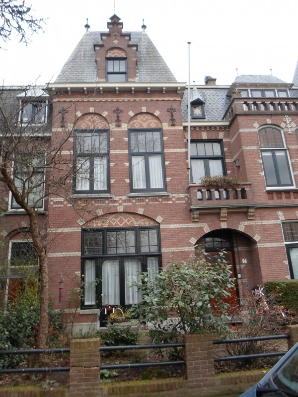 Herenhuis op rechthoekige plattegrond, bestaande uit begane grond en verdieping onder een afgeknot schilddak, drie assen breed. In de rode bakstenen gevel is ter accentuering van neggen, strekken, bogen en sierbanden witte kalksteen toegepast. Het linkerdeel van de gevel is als risaliet uitgebouwd en gedekt door een schilddak met pirons. Hierin is een dakkapel met trapgevel geplaatst. De vensters zijn voorzien van glas-in-lood bovenlichten en onderverdeeld in verticale roeden. De ingang is in een getoogd portiek gesitueerd, waarboven een balkon op natuurstenen consoles, afgesloten door een gemetseld boogvormig balkonhek. De voordeur bezit smeedijzeren panelen. De lage bakstenen muur die de scheiding vormt tussen straat en tuin is in later tijd vernieuwd. Waardering.