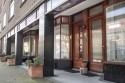 De winkelgalerij heeft uitgebouwde etalages van hout met glas-in-lood bovenlichten, waartussen zich de deuren naar de bovenwoningen bevinden. Zeldzaam en goed bewaard gebleven is de afscheiding in de vorm van een ‘balk’ van glas-in-lood aan de bovenzijde tussen de kolommen. Zowel de voor- en achterkant áls de onderkant zijn voorzien van glas in lood; een bijzondere luchtige en elegante beëindiging van de diepzwarte kolommenrij.