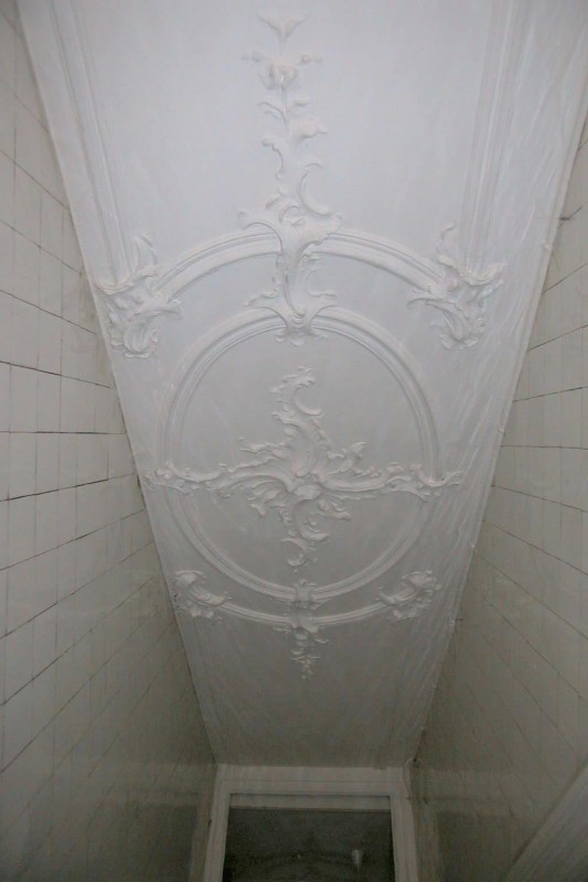 Zwart marmeren 19de-eeuwse schoorsteenmantel; deur met getoogd paneel, 18de eeuw, in geprofileerde omlijsting. Op de verdieping een eclectisch stucplafond en schoorsteenmantel, tweede helft 19 eeuw.