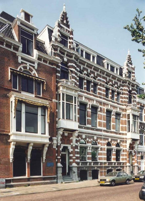 PAND in neo-renaissance trant uit het einde van de 19e eeuw, versierd met banden, geblokte strekken en boven de risaliet, waarin een houten erker, een topgevel.