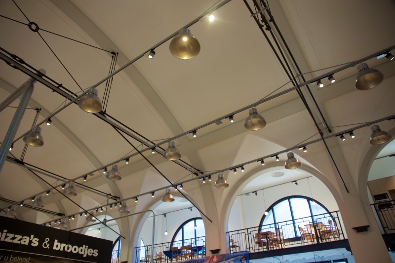 Het interieur van de zaal is van oorsprong ongedeeld met een boven- en benedengalerij en is onder meer voorzien van geschilderde decoraties op de wanden en plafonds. Voor de constructie van de zaal is gewapend beton volgens het systeem Monier toegepast. Het is een van de vroegste voorbeelden van een dergelijke constructiewijze in Nederland. De betonnen korfbogen (dit zijn betonnen ribben van een overspanning met 20 meter) worden aan de zijkanten telkens opgevangen door vier portalen, die uit een drager, een onderslagbalk en liseen/steunbeer in de gevel bestaan. Tussen de ribben liggen de Monierschalen. Trekstangen vangen de spatkrachten van de boog op.