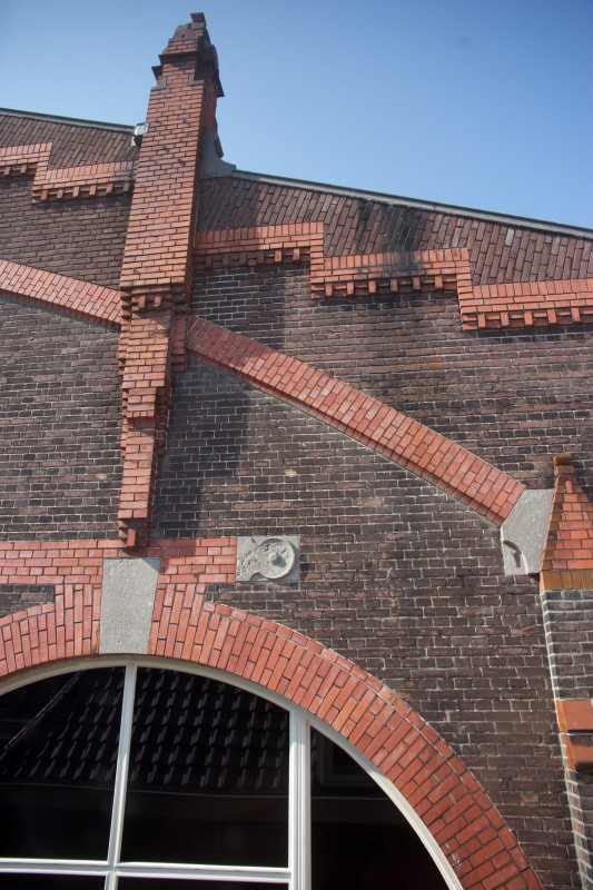 De bakstenen langsgevels van de zaal zijn vijf traveeen breed en worden door lisenen onderverdeeld. Onder de gootlijst is rijk siermetselwerk aangebracht. Beide gevels hebben bovenin grote rondboogvormige vensters voor de lichttoetreding van de achtergelegen galerijen. In de gevel aan de Johannes Camphuysstraat zijn op de begane grond moderne inrijdeuren geplaatst. Bij de andere langsgevel wordt het zicht op de begane grond aan de buitenzijde ontnomen door een latere aanbouw. De achter- en voorgevel van de grote zaal hebben een klimmend fries met horizontaal aangebrachte natuurstenen banden.