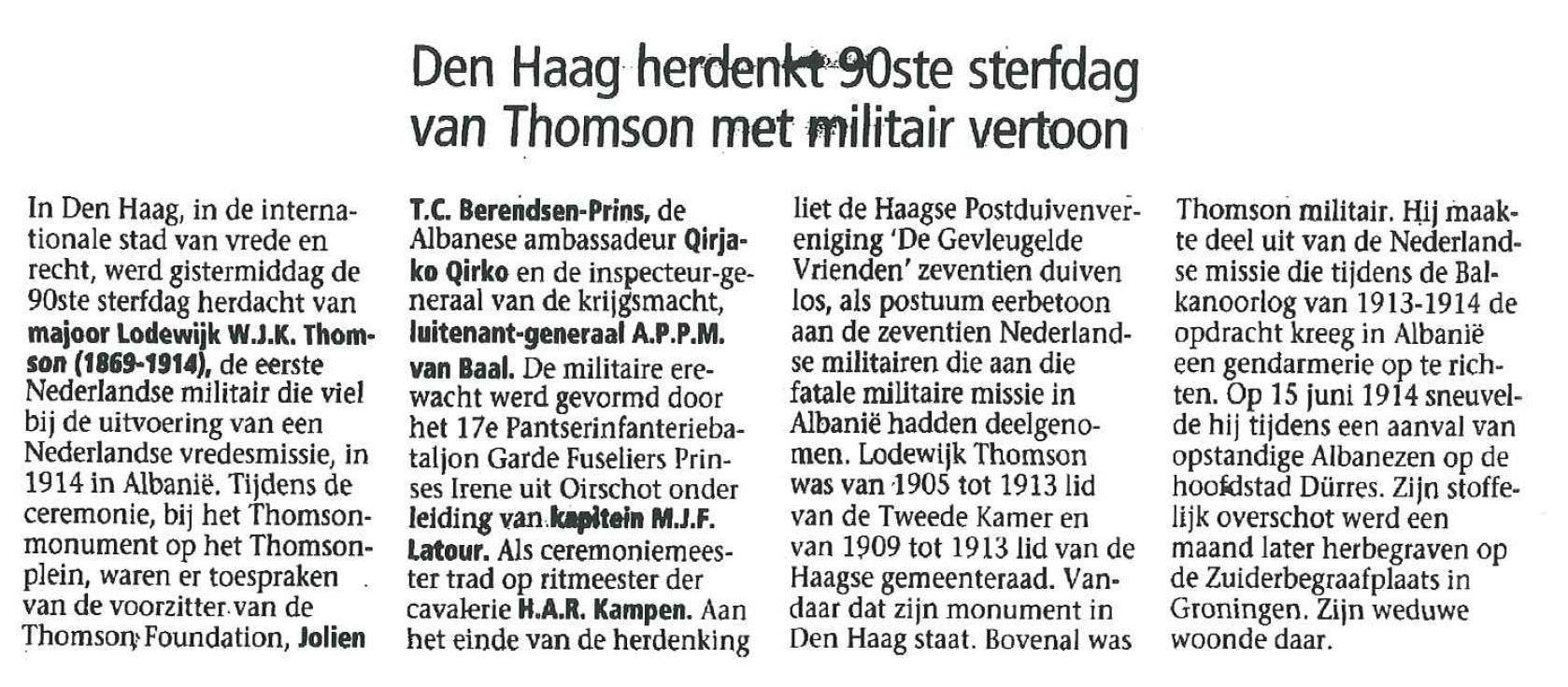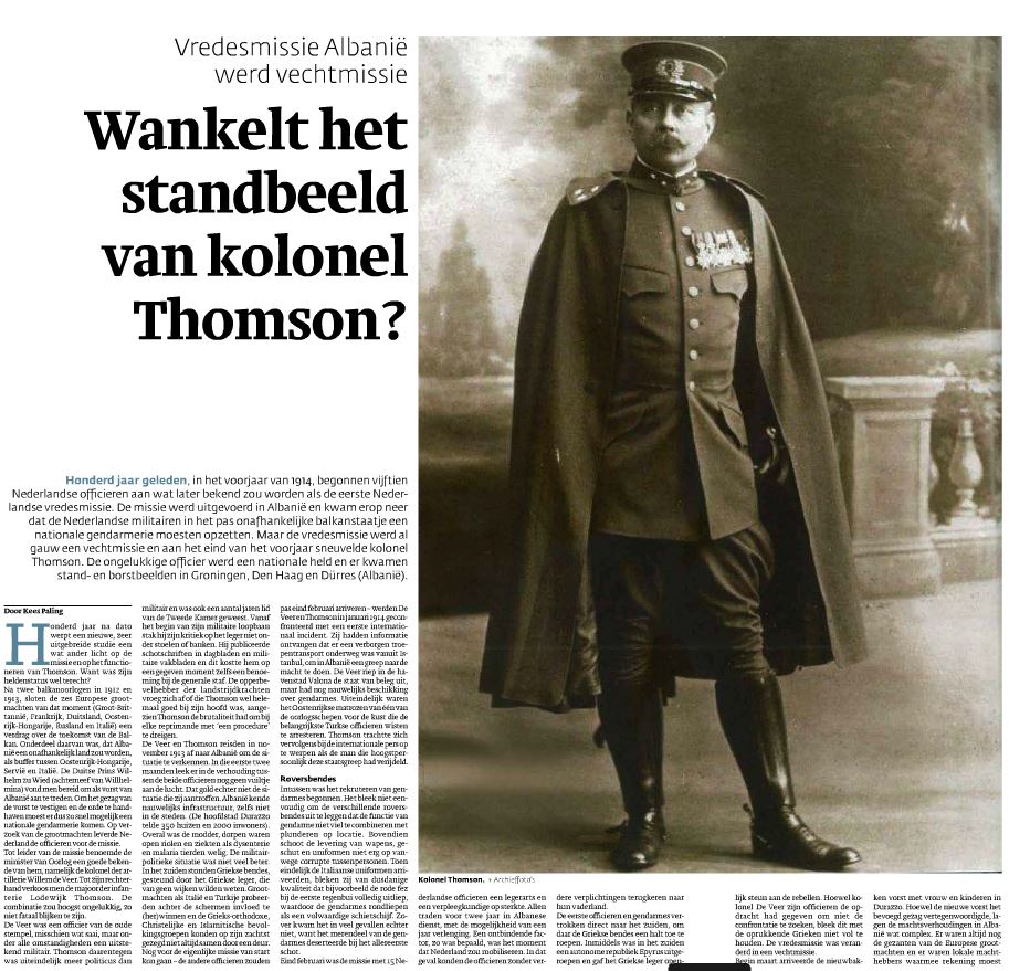 Majoor Thomson was opperbevelhebber van de Nederlandse militaire missie die in 1913 naar Albanie werd gezonden met als doel om de Albanese gendarmerie te organiseren en om orde te scheppen in het sinds 1912 onafhankelijke koninkrijk. Op 15 juni 1914 kwam hij tijdens een veldslag om het leven.