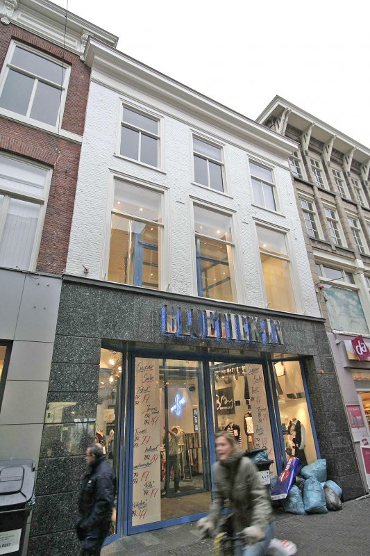 De voorgevel is een brede op vlucht gebouwde drielaags lijstgevel uit de achttiende eeuw. De gevel was aanvankelijk uitgevoerd in schoon metselwerk, maar is naderhand wit geschilderd. In de hoeken van de gevel zijn klezoortjes in de hoekverbanden herkenbaar. De kozijnen op de verdiepingen dateren waarschijnlijk nog uit de achttiende eeuw; de geprofileerde lijsten zijn een toevoeging uit de 19de eeuw. De geprofileerde kroonlijst dateert eveneens uit de negentiende eeuw. Het pand is intern meerdere malen ingrijpend verbouwd waarbij ook telkens de pui op de begane grond werd vernieuwd. De huidige winkelpui is van vrij recente datum.