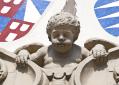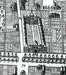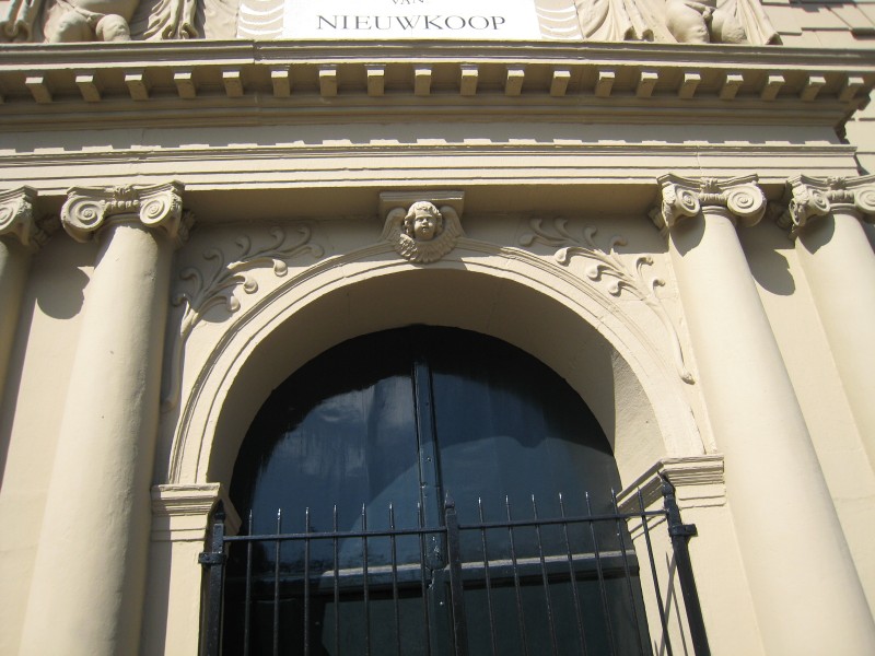 Hofje van Nieuwkoop, omstreeks 1660 gebouwd door Pieter Post, natuurstenen omlijsting van de ingang met opschrift-cartouche - rijk versierde (oorspronkelijke) ingang aan de zijde van de Prinsengracht - in de regentenzaal schouw uit de stichtingstijd.