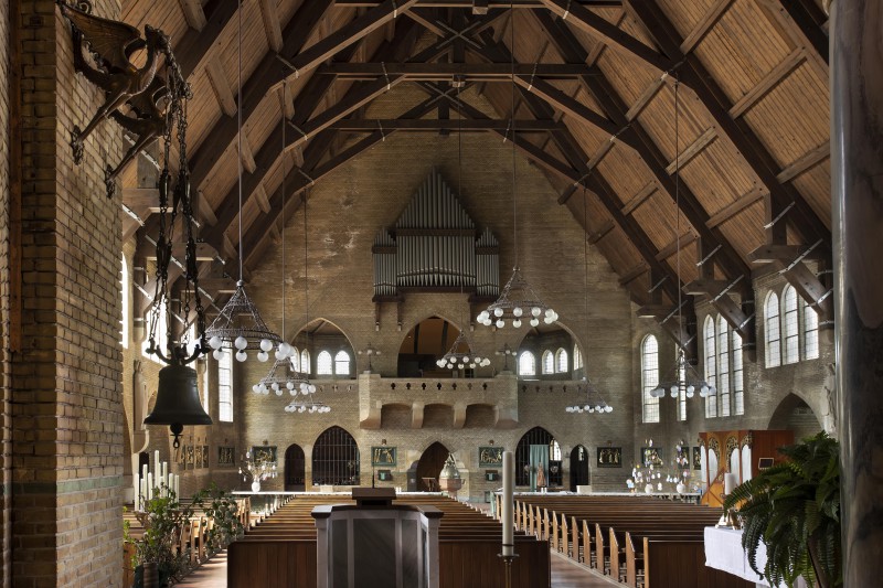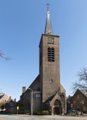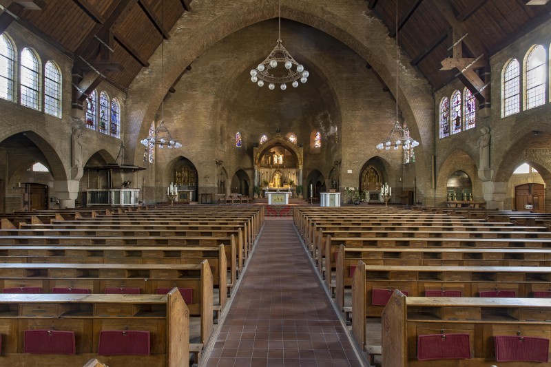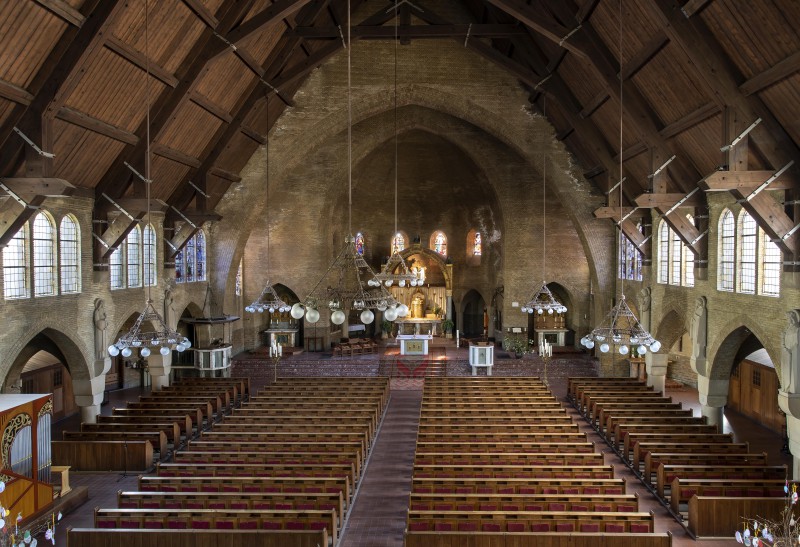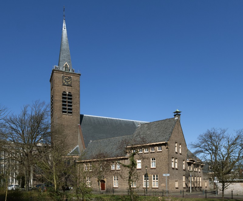 De voormalige kosterswoning, Dreibholtzstraat 1, is een langgerekt bakstenen gebouw met zadeldak tussen puntgevels met vlechtingen, op onregelmatige plattegrond, met verdieping en aan de westzijde uitgebouwde parterre waarboven een terras met gemetselde borstwering. Kerk, toren, sacristie en voormalige kosterswoning zijn voornamelijk in baksteen uitgevoerd. Natuursteen is toegepast voor constructief belangrijke onderdelen, zoals hoekblokken, lateien, plinten, steunbeerafdekkingen, pijlers en consoles. De bedakingen en de torenspits bezitten een leidekking. De zware houten deuren zijn alle uitgevoerd met smeedijzeren gehengen. Het als schoon-werk behandelde interieur van de kerk bezit ronde, natuurstenen pijlers met teerlingkapitelen en imposten, vanwaar af de rechthoekige, bakstenen scheibogen opgaan, die de zijbeuken van het middenschip scheiden. De hoge, ziende overkapping is uitgevoerd in hout, de apsiskalot en de overwelving van de zijbeuken zijn in baksteen gemetseld. Het priesterkoor wordt van de kerkruimte gescheiden door een wijde, spitse triomfboog; daarachter opent zich een smallere boog naar de apsis die door een ondiepe, met spitsbogen op pijlers geopende, omgang is omgeven. Aan weerszijden van de apsis bevinden zich in het muurvlak uitgespaarde spitsboognissen waarin de zijaltaren zijn geplaatst. De westwand van het schip is door drie spitsbogen geopend naar het zangkoor en twee nevenruimten. Voor de middelste boog is een uitgebouwd balkon met gemetselde borstwering op natuurstenen, door bogen verbonden, overkragingen. De benedenzone van de westwand bezit in het midden de deur naar het torenportaal en aan weerskanten de toegangen tot de kapellen naast de toren, alle met spitsbogen op natuurstenen aanzetstukken.