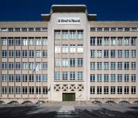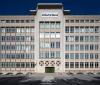 De voorgevel is 40 vensterassen breed. De middenrisaliet telt vier en de flankerende vleugels 18 vensterassen. De in oorsprong stalen vensters, zijn vervangen door aluminium ramen met een profielbreedte die die van de stalen ramen benadert. De vensters van de kelder zijn rondboogvormig. Die van de eerste tot en met de vijfde bouwlaag zijn rechthoekig en hebben een zesruitsverdeling. De vensters van de zesde bouwlaag, die de indruk geeft van een mezzanino, zijn eveneens rechthoekig maar lager en hebben een zesruitsverdeling.