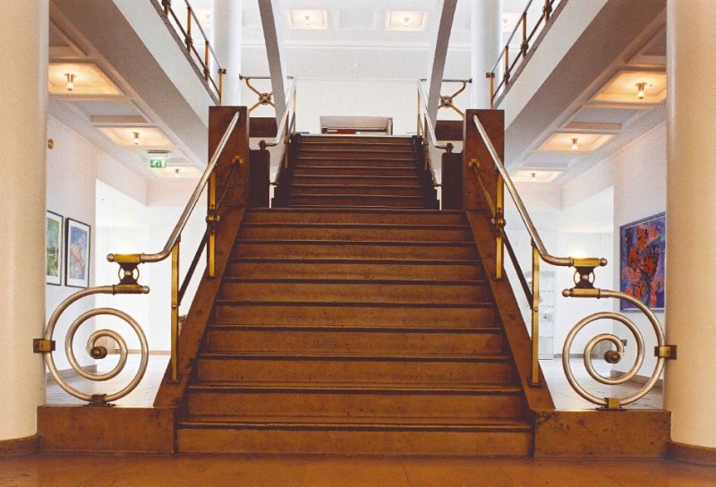 Het interieur is ten dele nog oorspronkelijk. De centrale hal, die achter de eenvoudige hoofdingang met bordestrappen ligt, bezit nog de ronde pijlers, cassettenplafonds en daarachter het centrale trappehuis, gedragen door een constructie van betonnen bogen en voorzien van metalen leuningen.