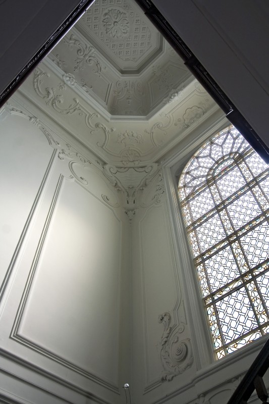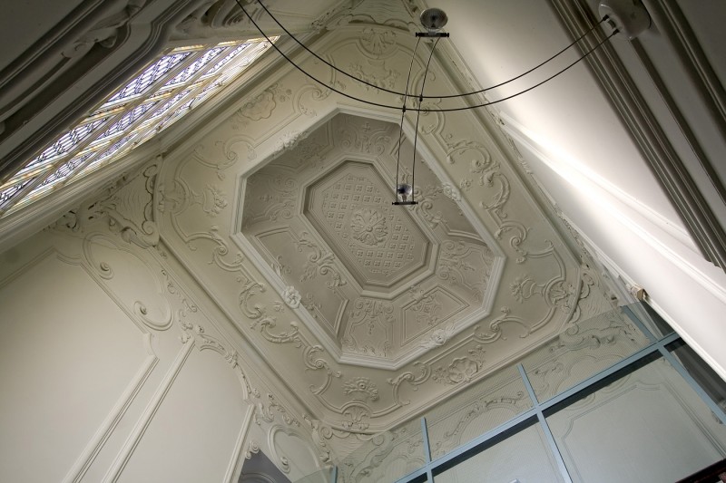 Pand met rijke Lodewijk XIV gevel met versierde middentravee op hardstenen plint - inwendig stucdecoraties uit de bouwtijd.