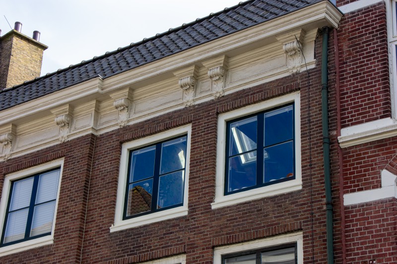 Pand met Lodewijk XIV gevel met rechte kroonlijst op gesneden consoles, ingangspartij met pilasterstelling.