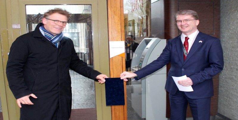Shawn Crowley, Chargé d'Affaires op de Amerikaanse Ambassade, en wethouder Joris Wijsmuller onhulden op 21 april j.l het rijksmonumentenschildje bij de hoofdingang van het gebouw.
